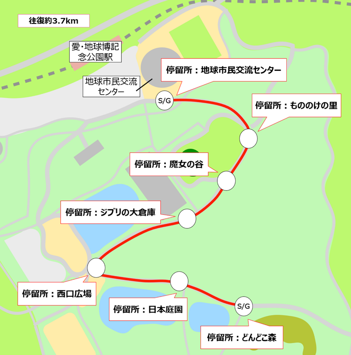 - 地球市民交流センター ~ もののけの里 ~ 魔女の谷 ~ ジブリの大倉庫 ~ 西口広場 ~ 日本庭園 ~ どんどこ森(往復)