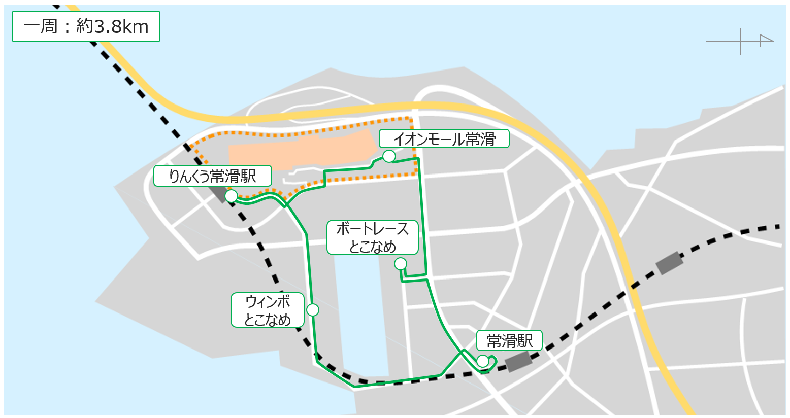 - 常滑駅 → ボートレースとこなめ → イオンモール常滑 → りんくう常滑駅 → ウィンボとこなめ → 常滑駅